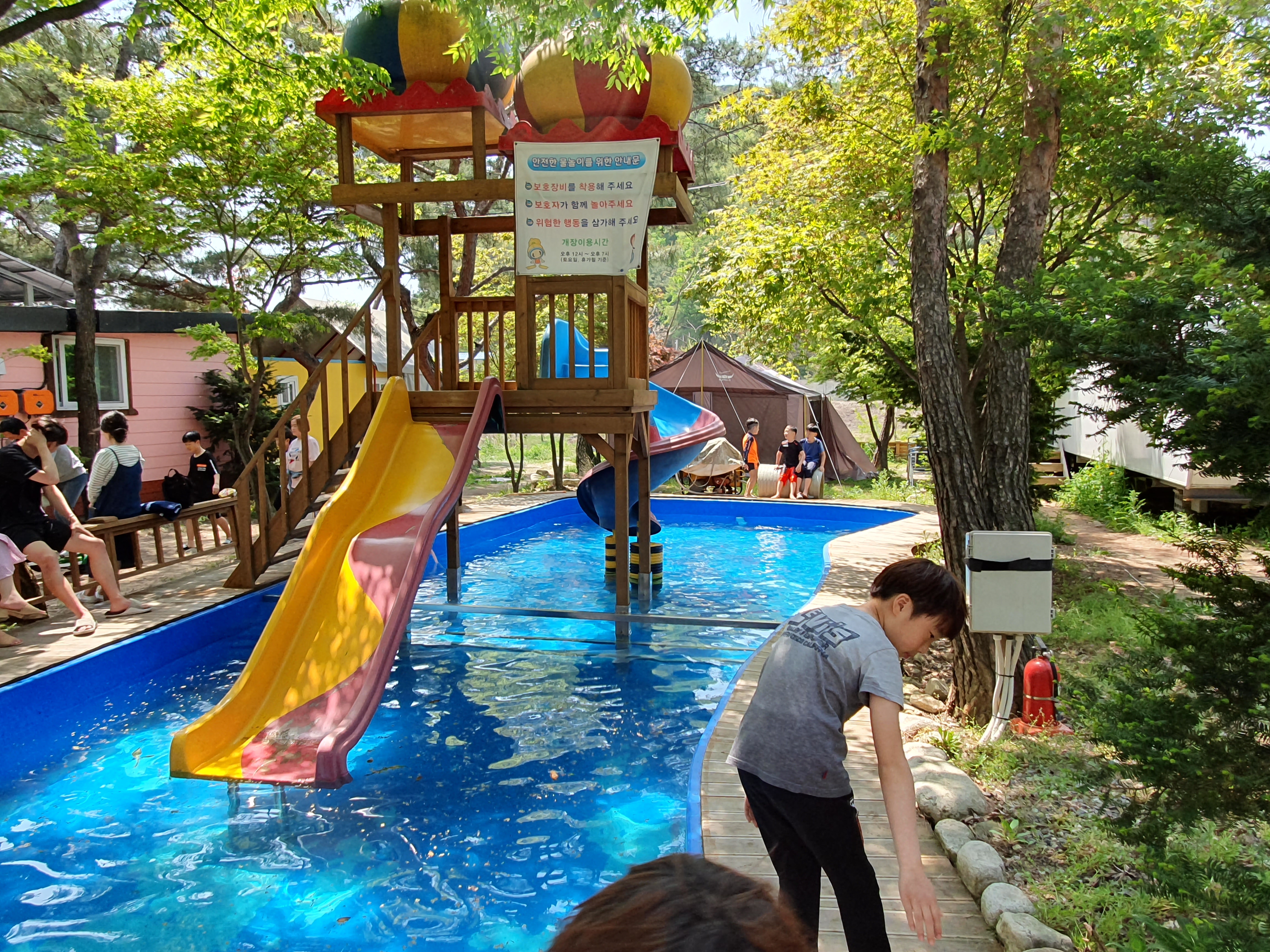 아이들이 놀기 좋은 풀장과 미끄럼틀이 있음