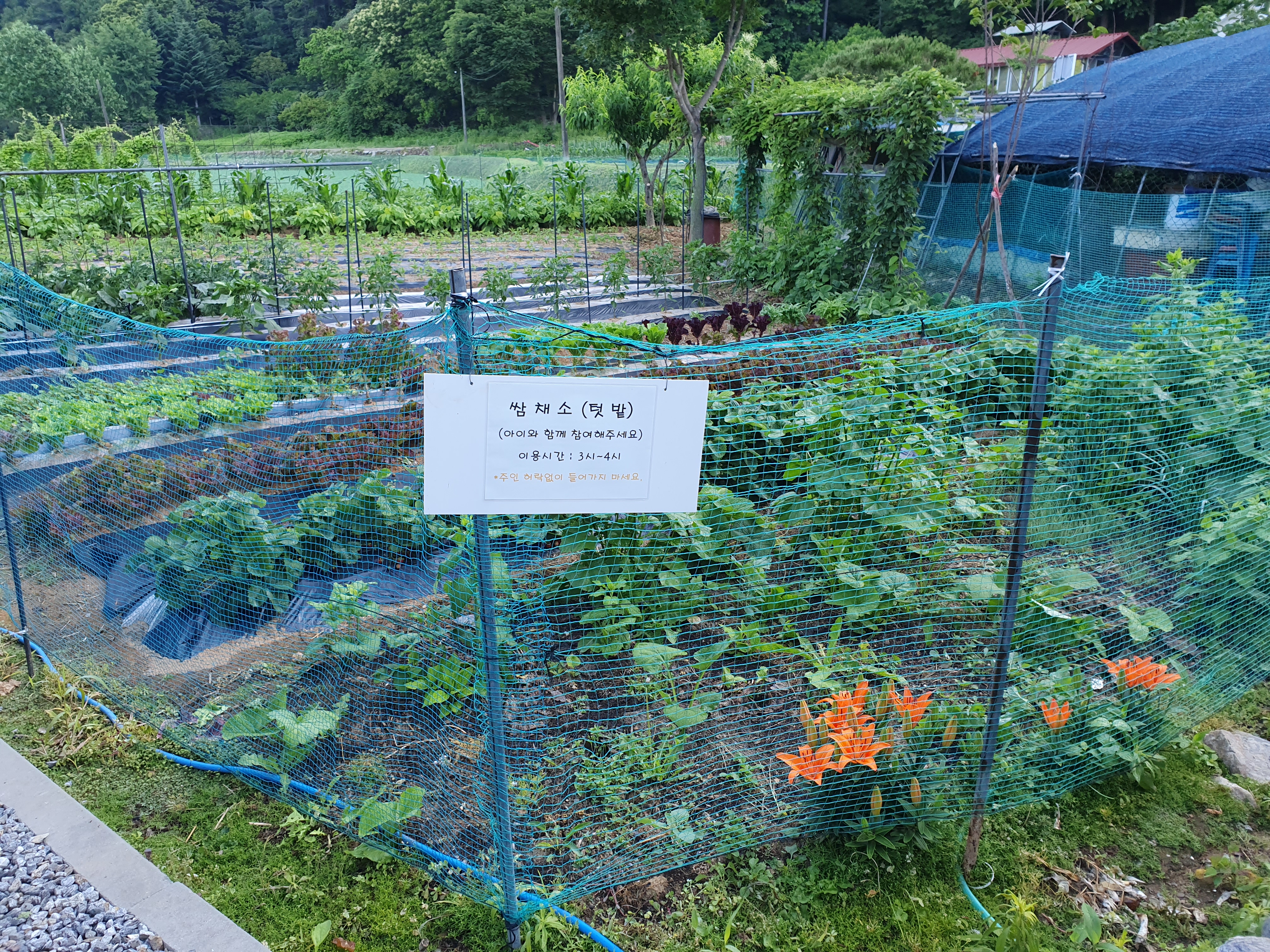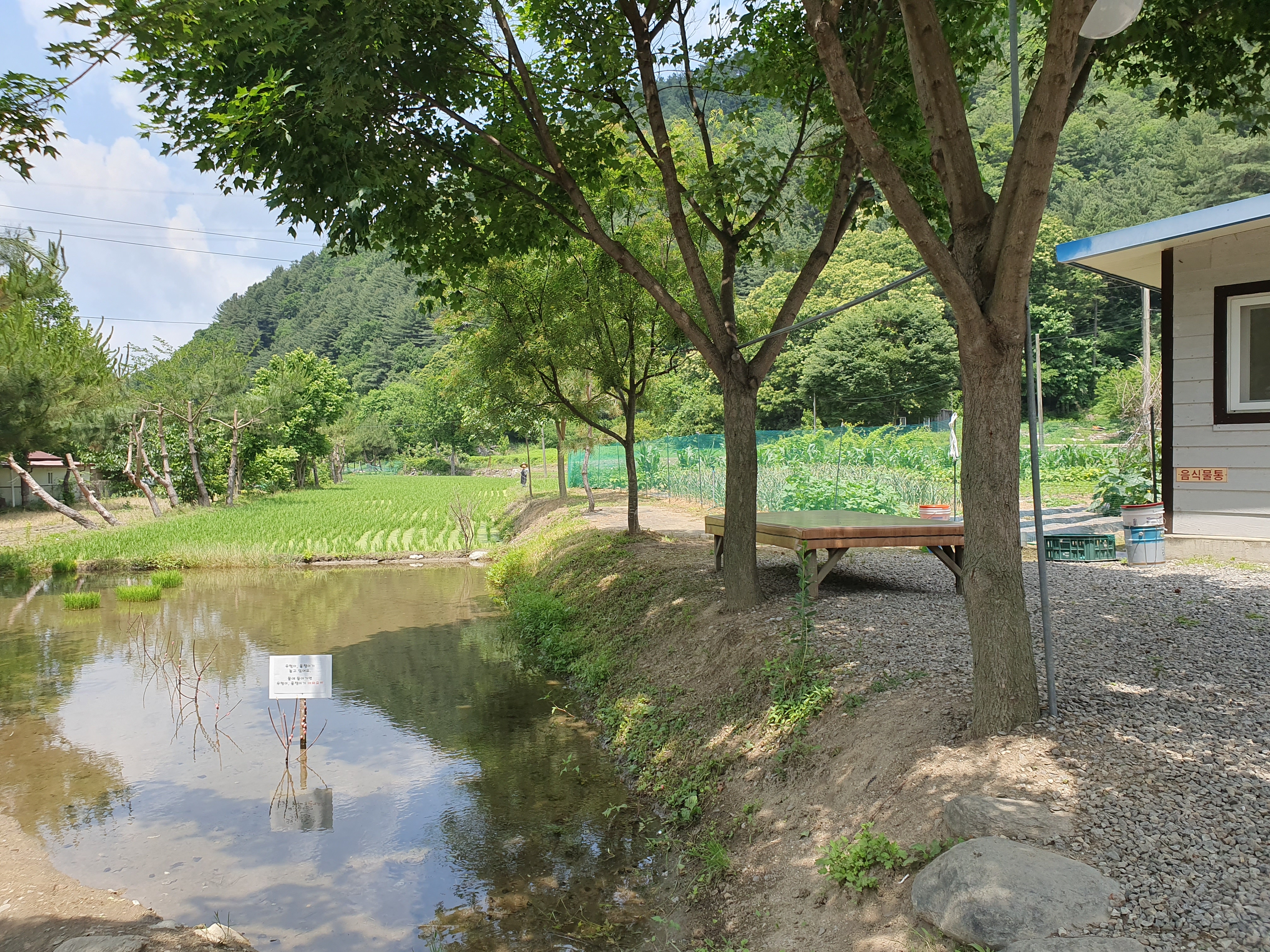 캠핑장의 특징은 논에 사는 우렁이, 올챙이를 체험할 수 있으며, 쌈용 채소를 이용할 수 있는 점이 좋습니다.